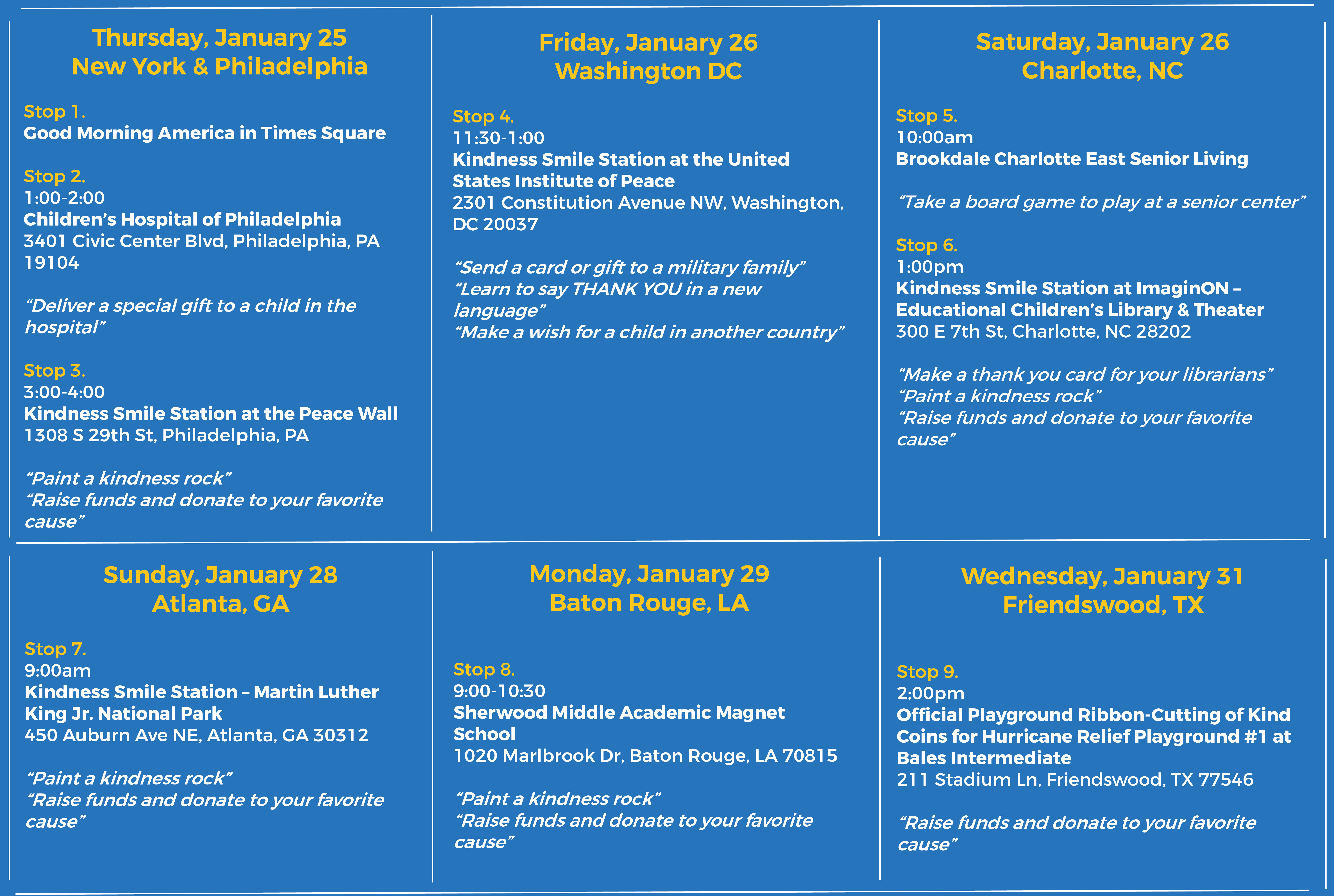 We joyfully stopped in multiple cities along the way to complete all 50 kind acts on the Family Edition checklist.