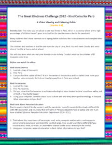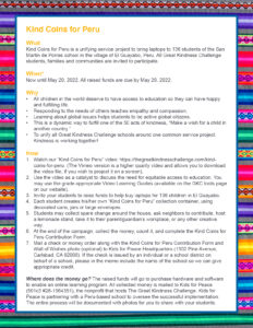 The 2022 Kind Coins for Peru Campaign is a unifying service project to help bring laptops to students of the San Martín de Porres school in the village of El Guayabo – Pachacamac, Peru. All Great Kindness Challenge students, families, and communities are whole-heartedly invited to participate.